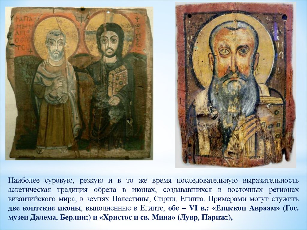 две коптские иконы, выполненные в Египте, обе – VI в.: «Епископ Авраам» (Гос.