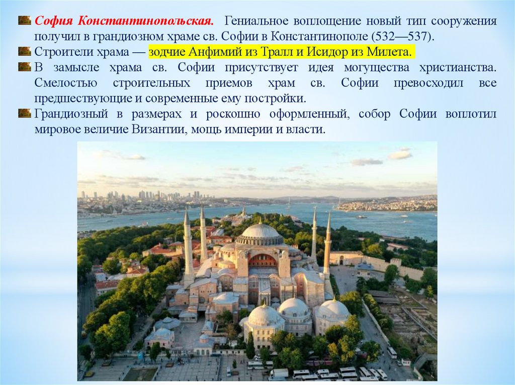 Строители храма — зодчие Анфимий из Тралл и Исидор из Милета.