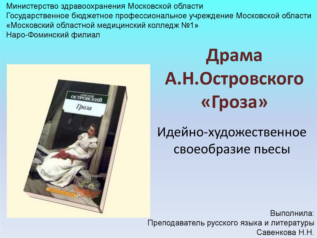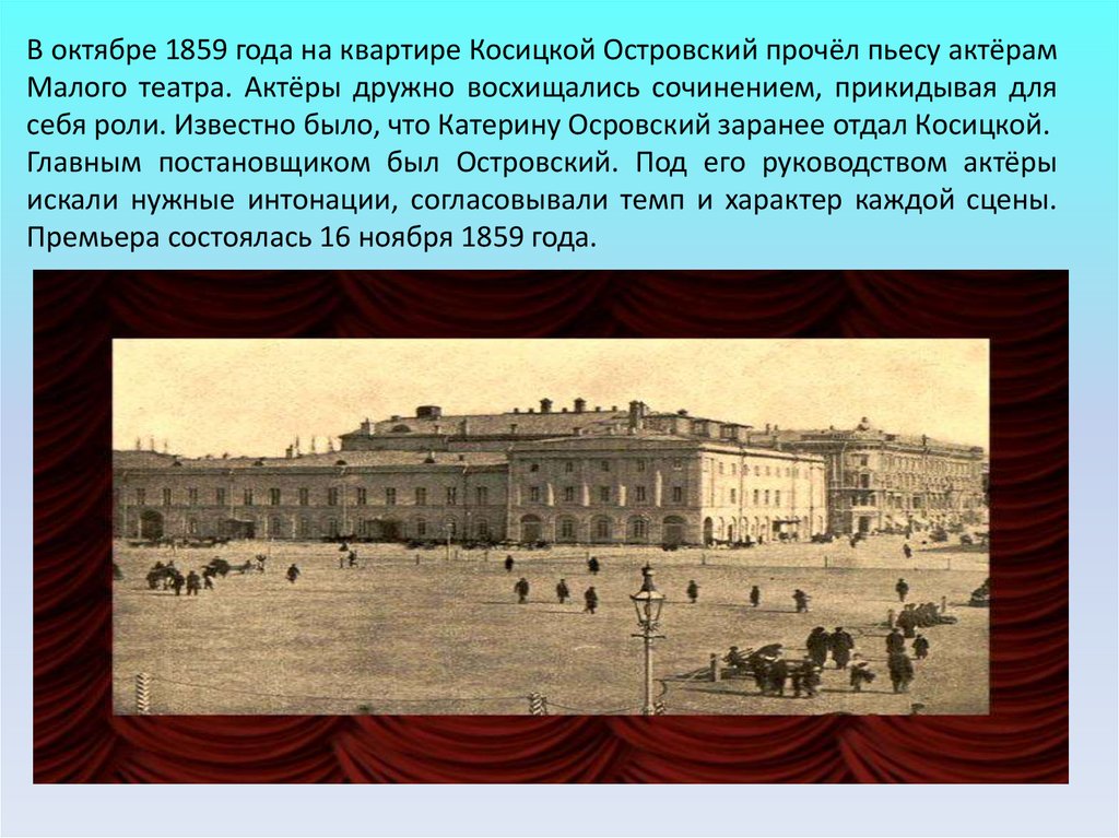 • Пьеса «Гроза» была написана Островским втечение лета и осени 1859 г., в этом же году