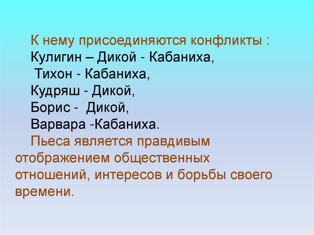 К нему присоединяются конфликты :Кулигин – Дикой - Кабаниха,