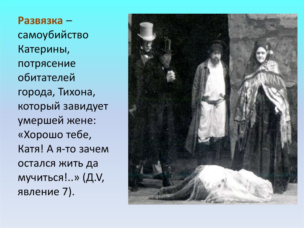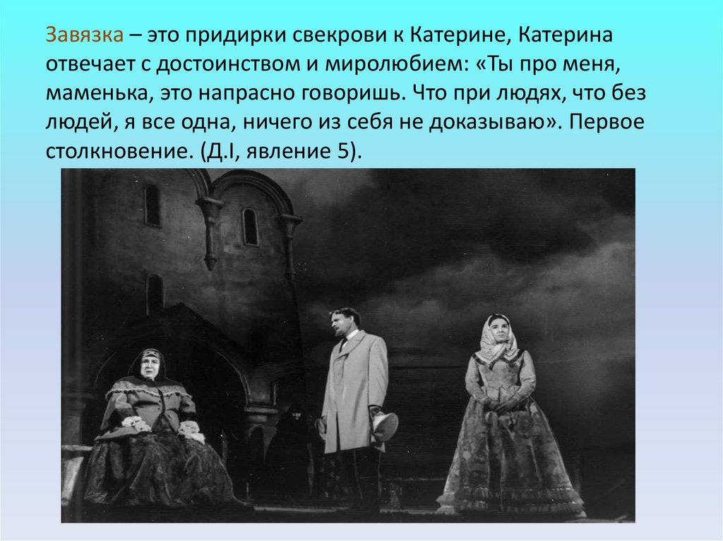 Завязка – это придирки свекрови к Катерине, Катеринаотвечает с достоинством и миролюбием: «Ты про меня,