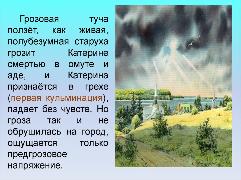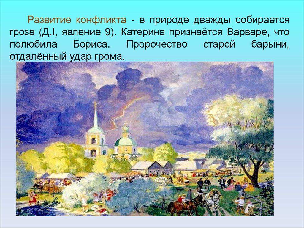 Развитие конфликта - в природе дважды собираетсягроза (Д.I, явление 9). Катерина признаётся Варваре, что