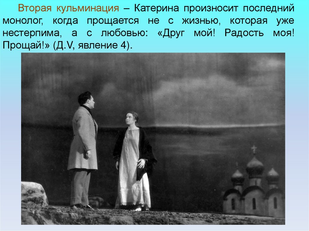 Вторая кульминация – Катерина произносит последниймонолог, когда прощается не с жизнью, которая уже
