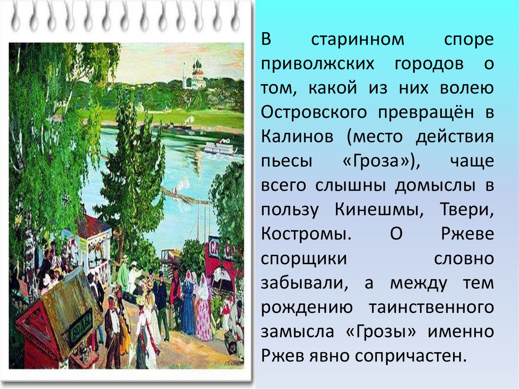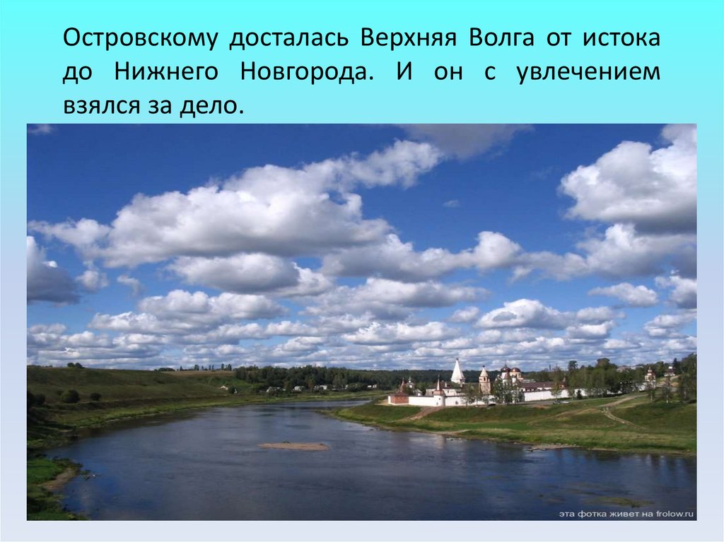 Островскому досталась Верхняя Волга от истокадо Нижнего Новгорода. И он с увлечением