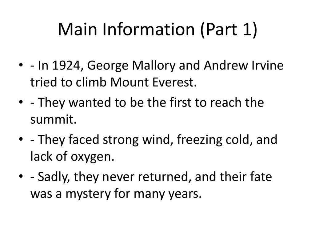 Main Information (Part 1)• - In 1924, George Mallory and Andrew Irvine