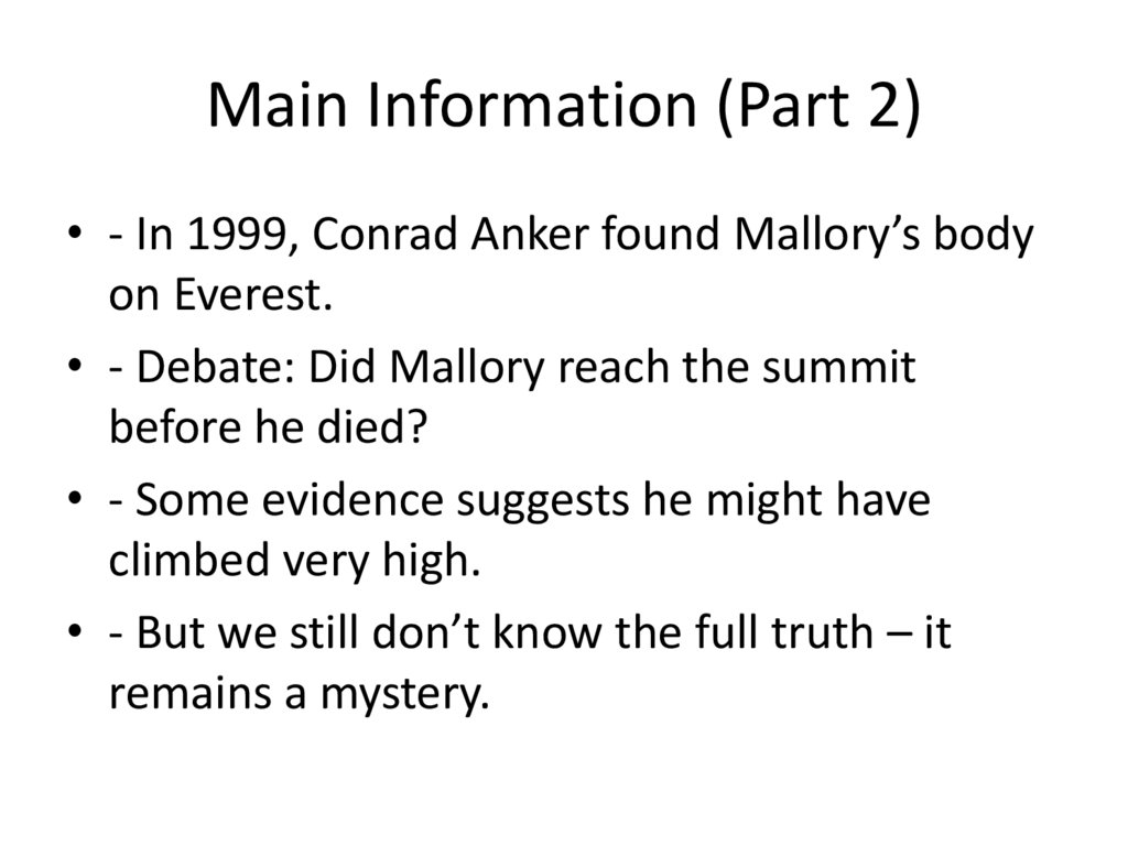 Main Information (Part 2)• - In 1999, Conrad Anker found Mallory’s body