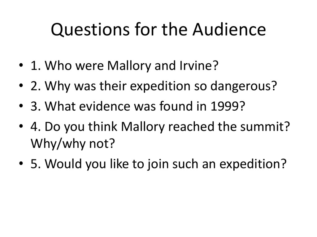 Questions for the Audience• 1. Who were Mallory and Irvine?