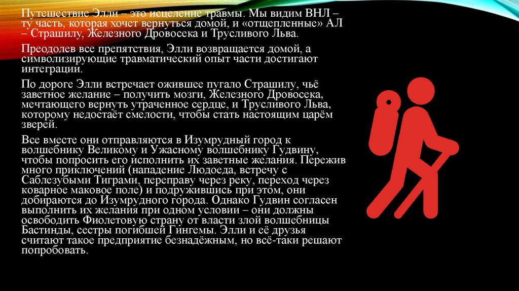 Путешествие Элли – это исцеление травмы. Мы видим ВНЛ –ту часть, которая хочет вернуться домой, и «отщепленные» АЛ