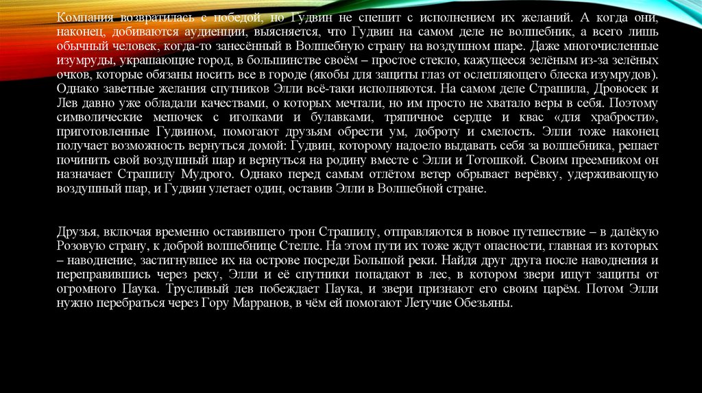 починить свой воздушный шар и вернуться на родину вместе с Элли и Тотошкой. Своим преемником он