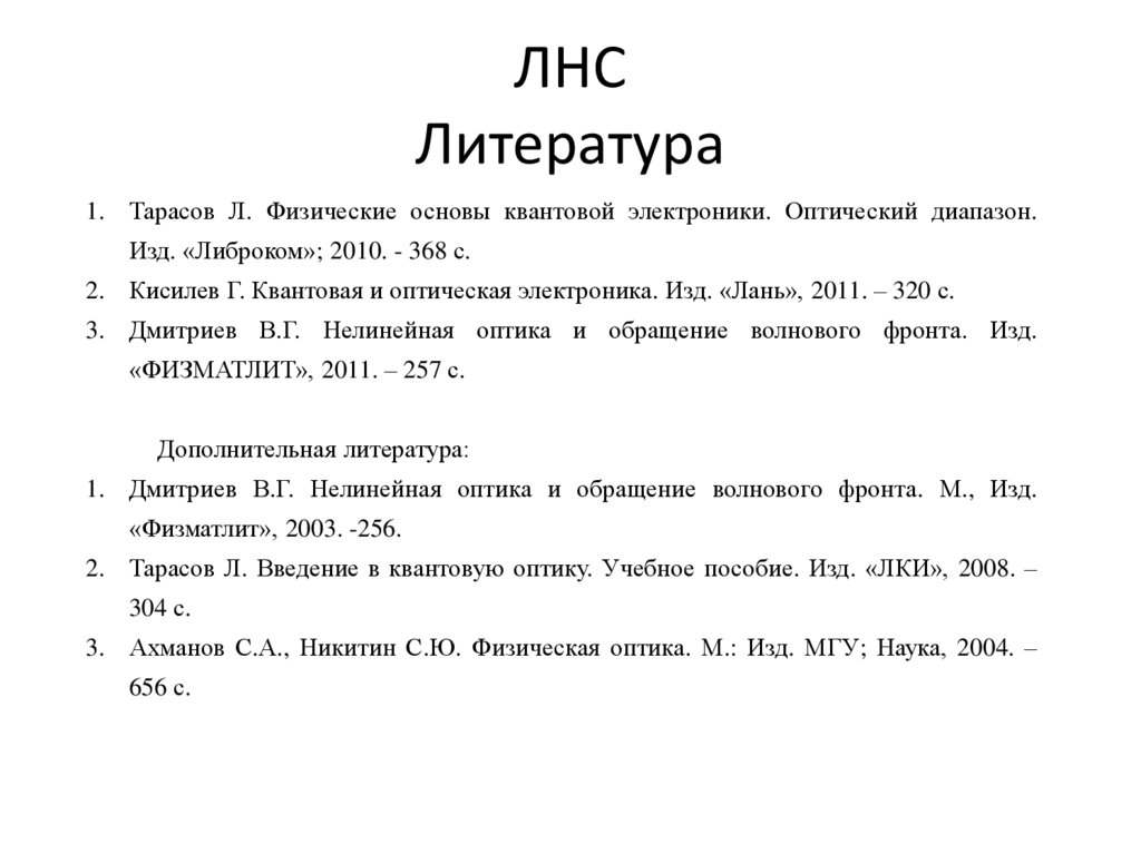1. Тарасов Л. Физические основы квантовой электроники. Оптический диапазон.Изд. «Либроком»; 2010. - 368 с.