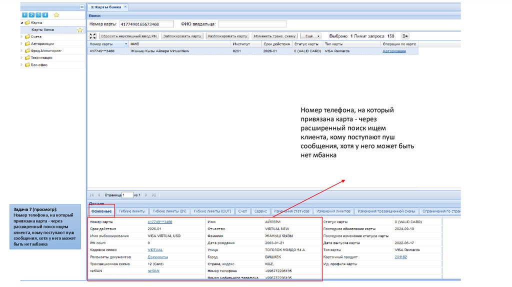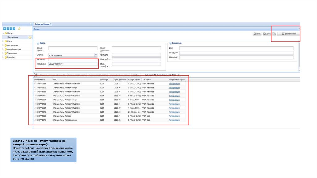 Задача 7 (поиск по номеру телефона, накоторый привязана карта):