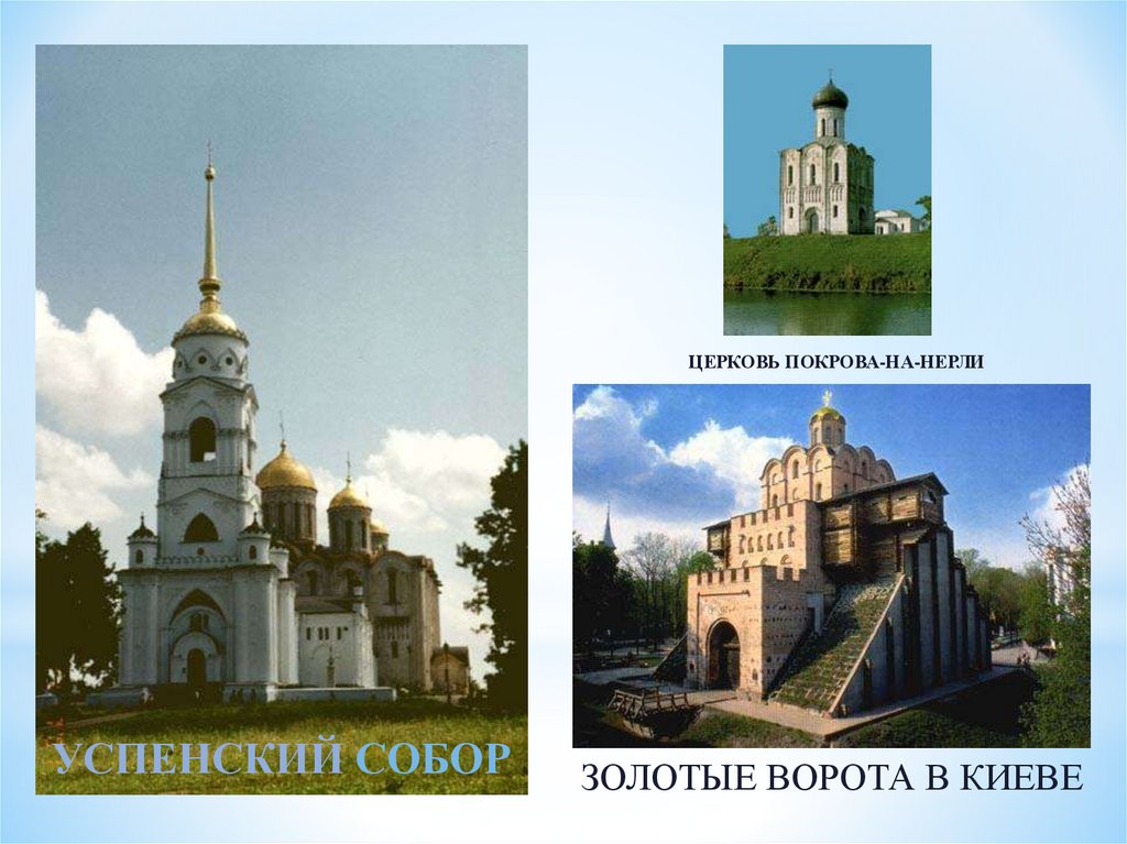 * Церковь Покрова на НерлиПостроена при Андрее Боголюбском, 12 в.,