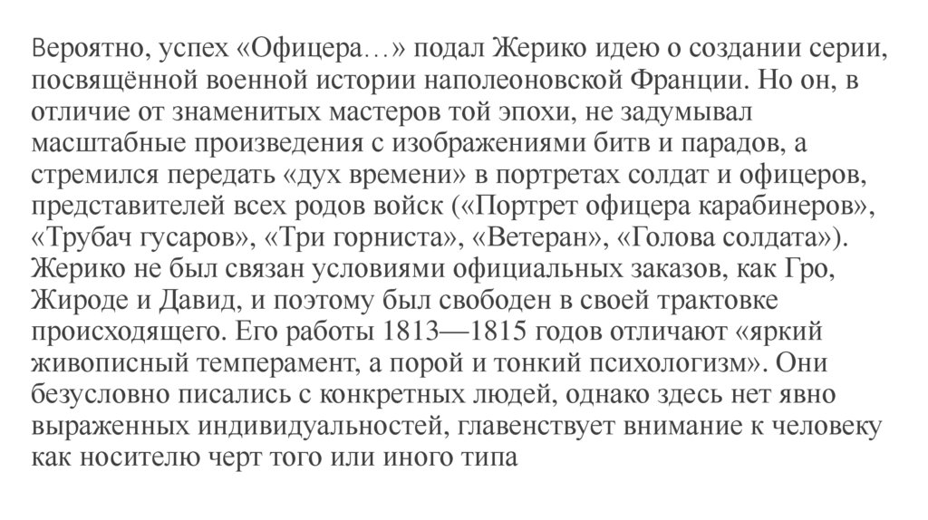 Вероятно, успех «Офицера…» подал Жерико идею о создании серии,посвящённой военной истории наполеоновской Франции. Но он, в