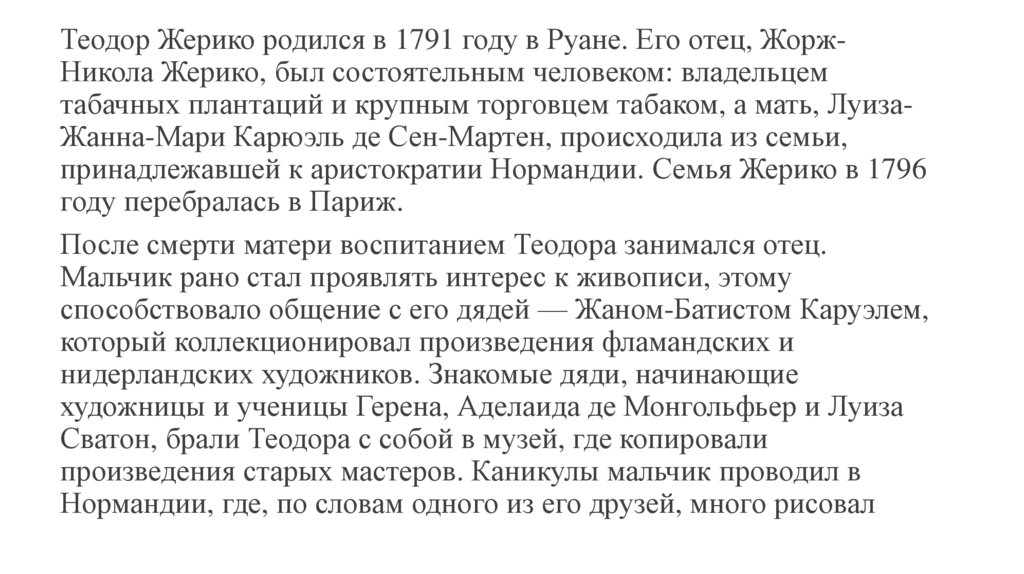 Теодор Жерико родился в 1791 году в Руане. Его отец, ЖоржНикола Жерико, был состоятельным человеком: владельцемтабачных плантаций и крупным торговцем табаком, а мать, ЛуизаЖанна-Мари Карюэль де Сен-Мартен, происходила из семьи,