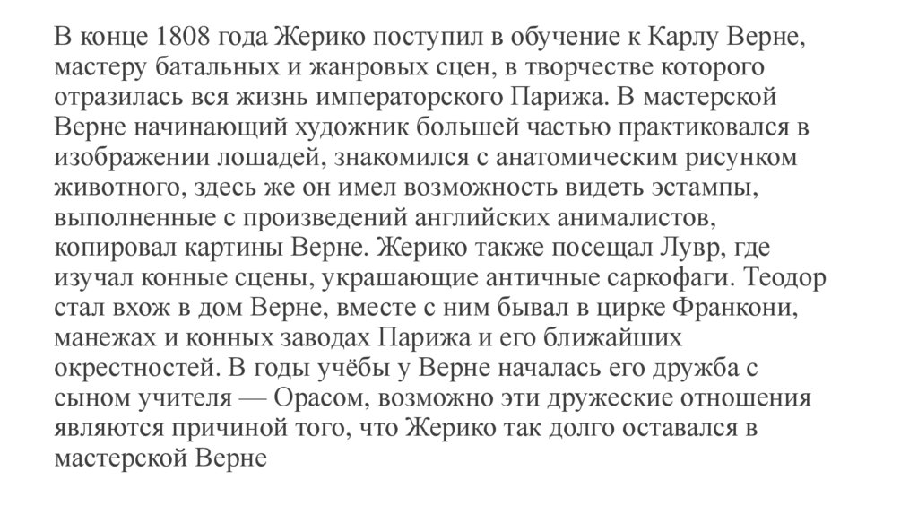 В конце 1808 года Жерико поступил в обучение к Карлу Верне,мастеру батальных и жанровых сцен, в творчестве которого