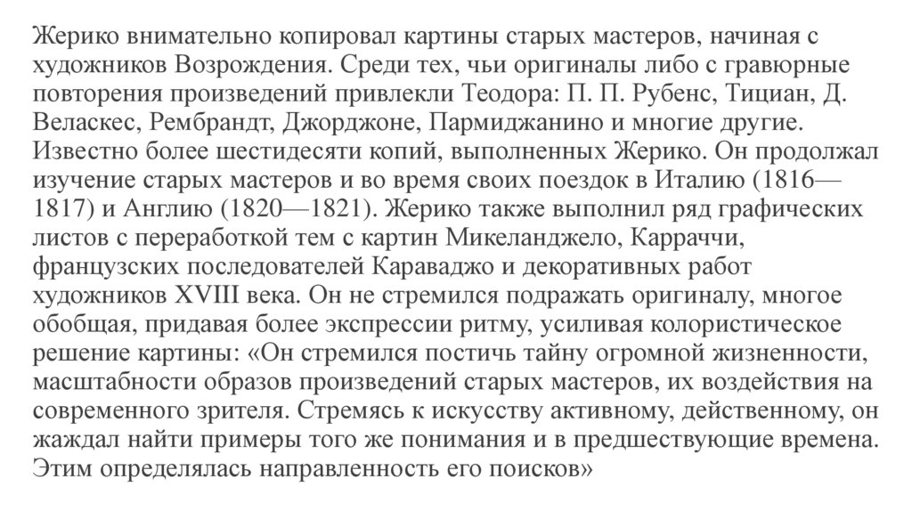 Жерико внимательно копировал картины старых мастеров, начиная схудожников Возрождения. Среди тех, чьи оригиналы либо с гравюрные
