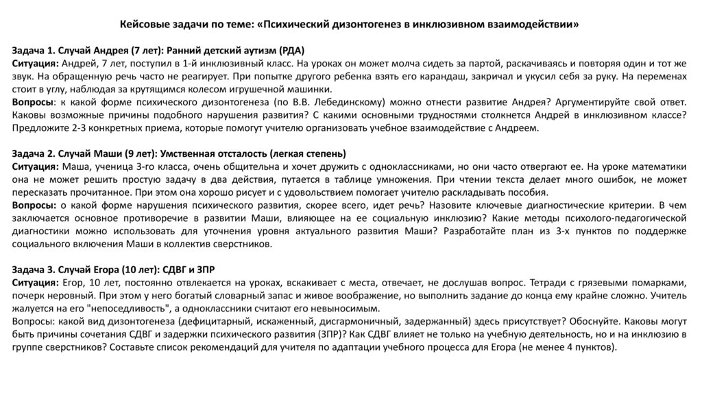 Кейсовые задачи по теме: «Психический дизонтогенез в инклюзивном взаимодействии»Задача 1. Случай Андрея (7 лет): Ранний детский аутизм (РДА)