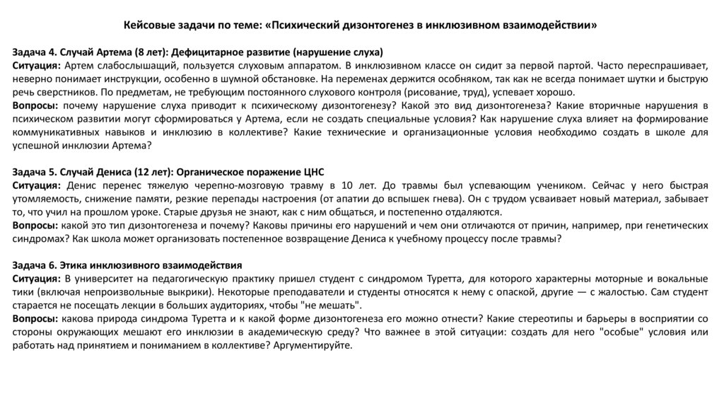 Кейсовые задачи по теме: «Психический дизонтогенез в инклюзивном взаимодействии»Задача 4. Случай Артема (8 лет): Дефицитарное развитие (нарушение слуха)