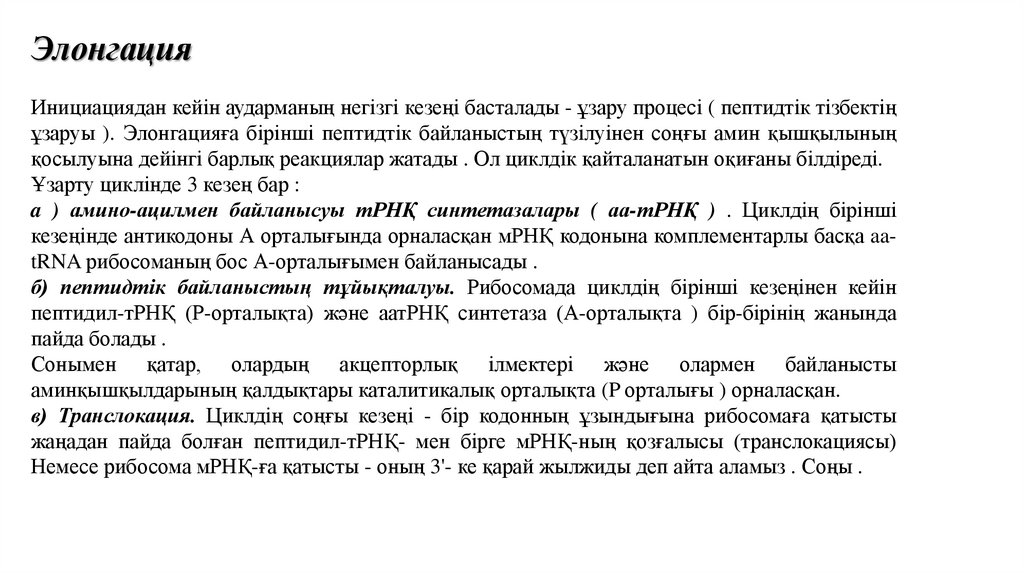 ЭлонгацияИнициациядан кейін аударманың негізгі кезеңі басталады - ұзару процесі ( пептидтік тізбектің