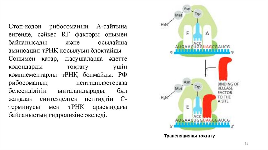 Стоп-кодон рибосоманың А-сайтынаенгенде, сәйкес RF факторы онымен