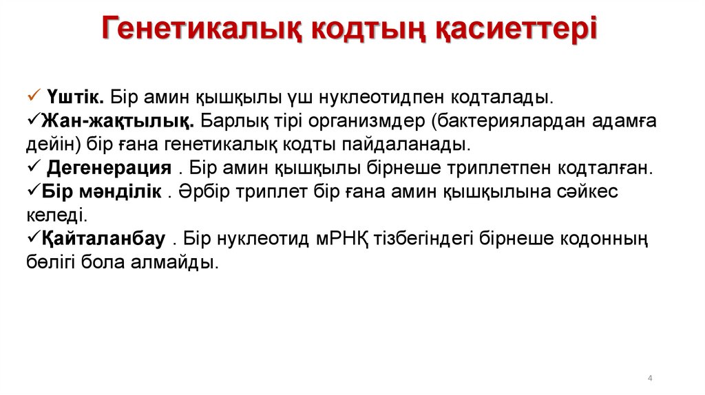 Генетикалық кодтың қасиеттеріҮштік. Бір амин қышқылы үш нуклеотидпен кодталады.