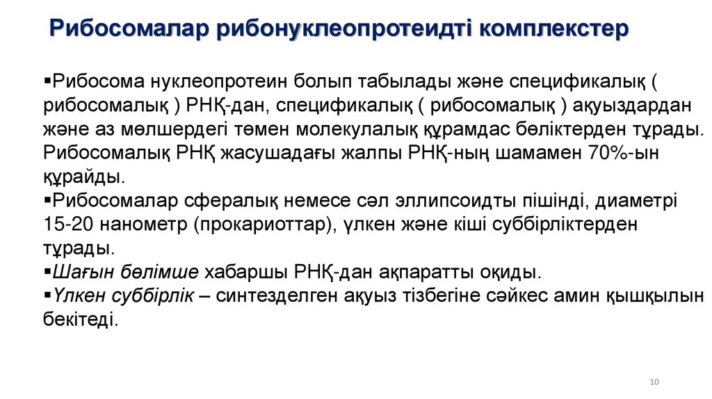 Рибосомалар рибонуклеопротеидті комплекстерРибосома нуклеопротеин болып табылады және спецификалық (