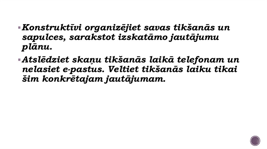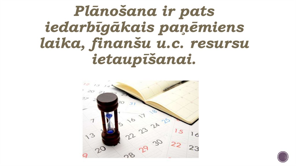 • Dzīves mērķu gradācija, vērtību apzināšana• Darba un atpūtas laika līdzsvarošana