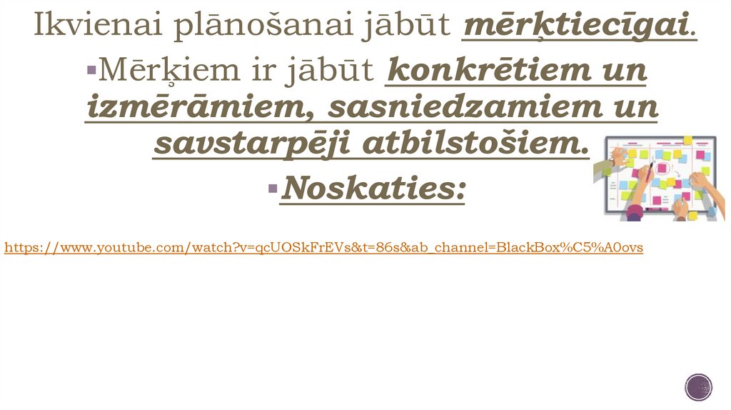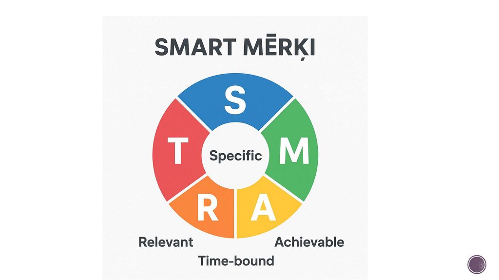 S (specific) – mērķis ir konkrēts un skaidrs, ir iespējaslielo mērķi sadalīt sīkākos;