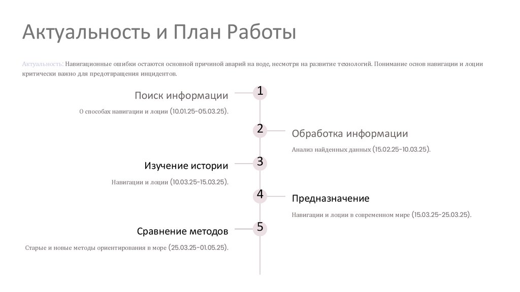Актуальность и План РаботыАктуальность: Навигационные ошибки остаются основной причиной аварий на воде, несмотря на развитие технологий. Понимание основ навигации и лоции