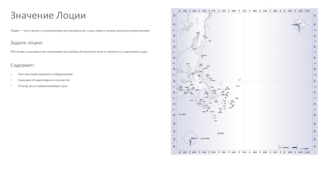 Значение ЛоцииЛоция — часть науки о судовождении, изучающая реки, озера, моря и океаны для нужд мореплавания.