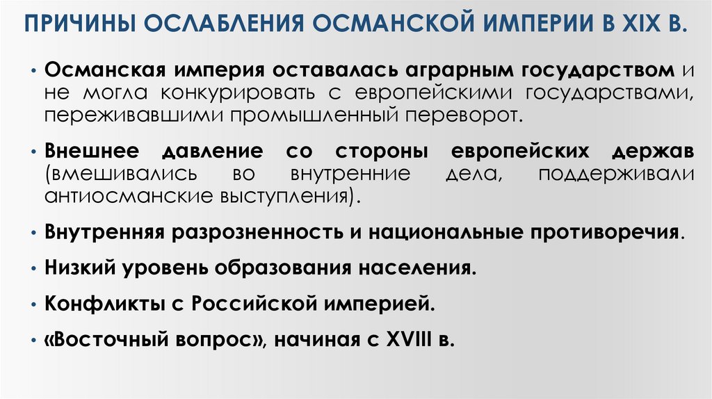ПРИЧИНЫ ОСЛАБЛЕНИЯ ОСМАНСКОЙ ИМПЕРИИ В XIX В.• Османская империя оставалась аграрным государством и