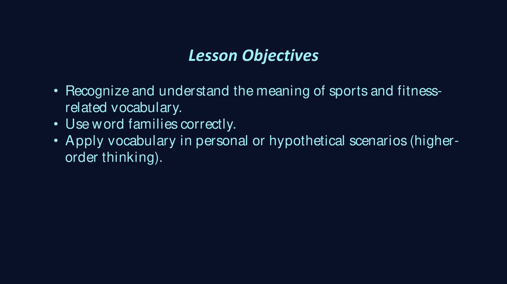 Lesson Objectives• Recognize and understand the meaning of sports and fitnessrelated vocabulary.