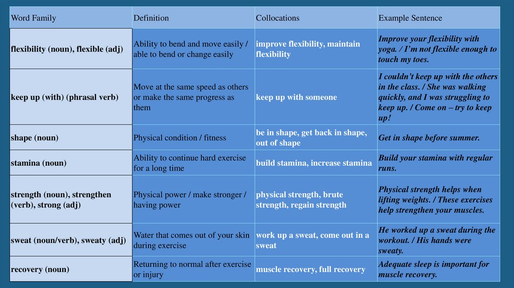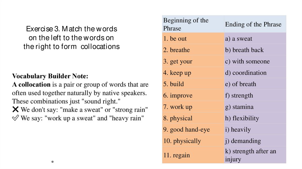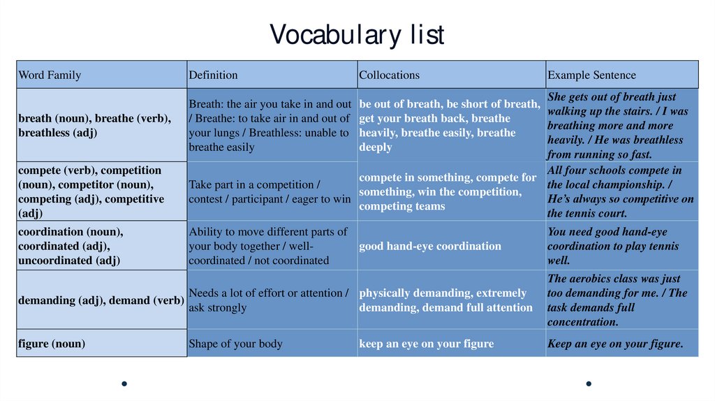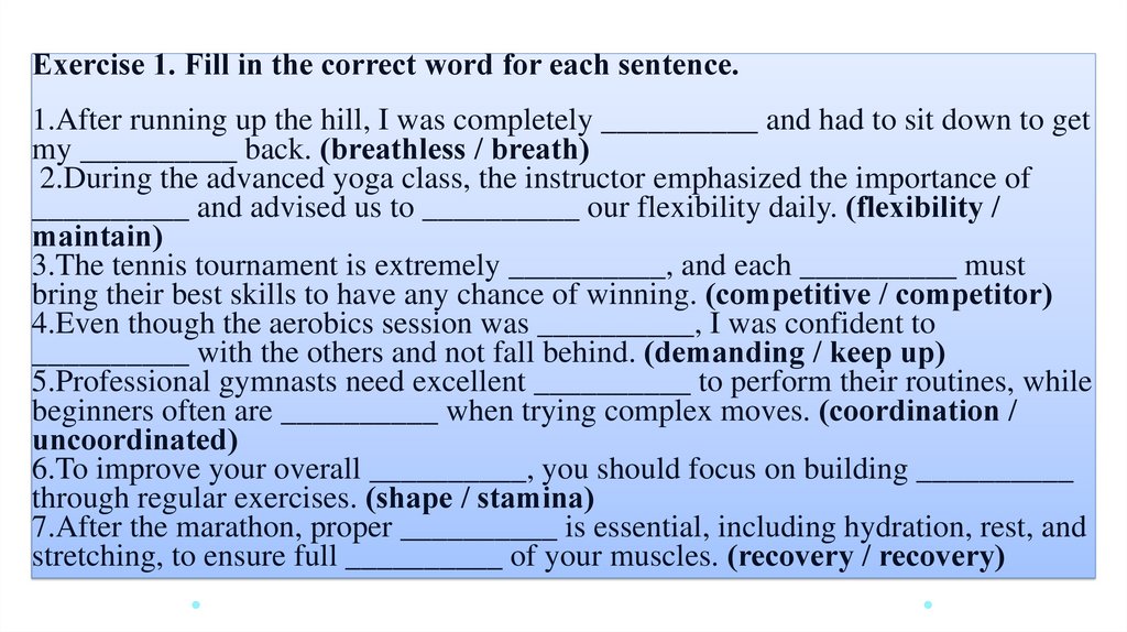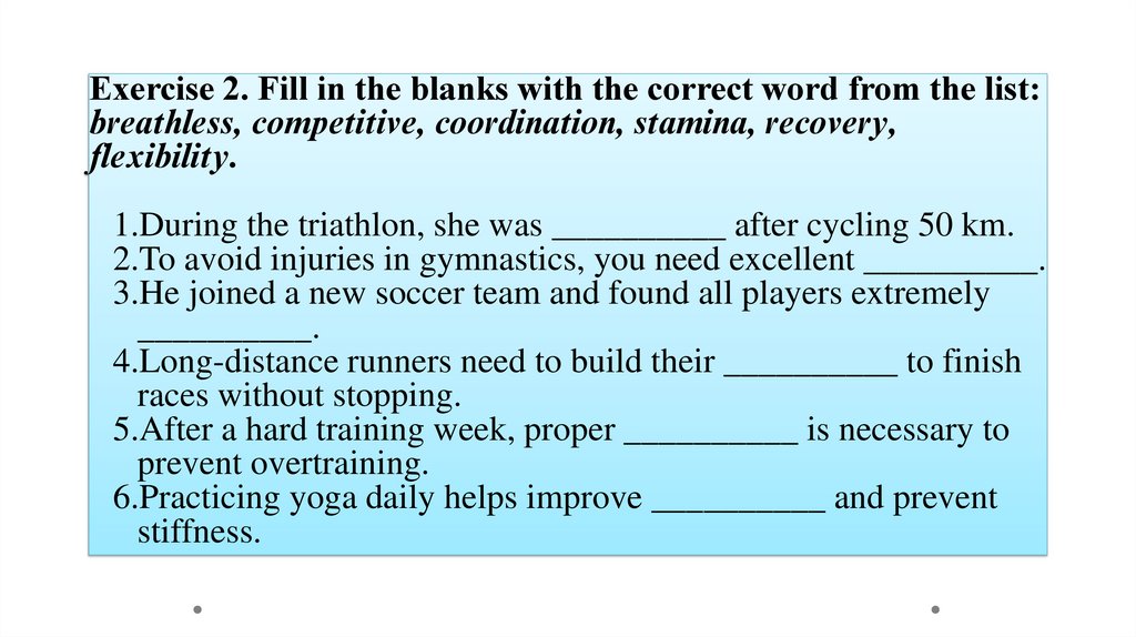 Exercise 2. Fill in the blanks with the correct word from the list:breathless, competitive, coordination, stamina, recovery,