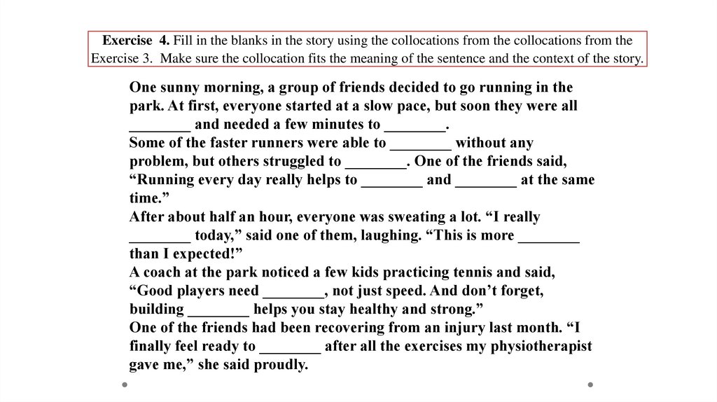 Exercise 4. Fill in the blanks in the story using the collocations from the collocations from theExercise 3. Make sure the collocation fits the meaning of the sentence and the context of the story.