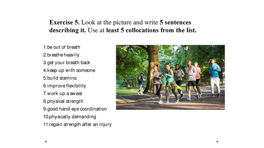 Exercise 5. Look at the picture and write 5 sentencesdescribing it. Use at least 5 collocations from the list.