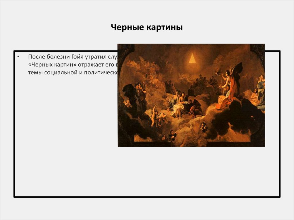 Черные картиныПосле болезни Гойя утратил слух и стал более замкнутым. Его знаменитая серия