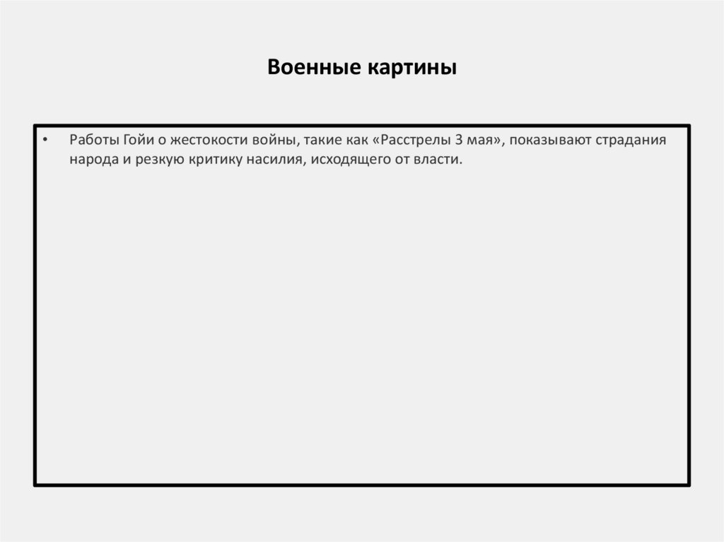 Военные картиныРаботы Гойи о жестокости войны, такие как «Расстрелы 3 мая», показывают страдания