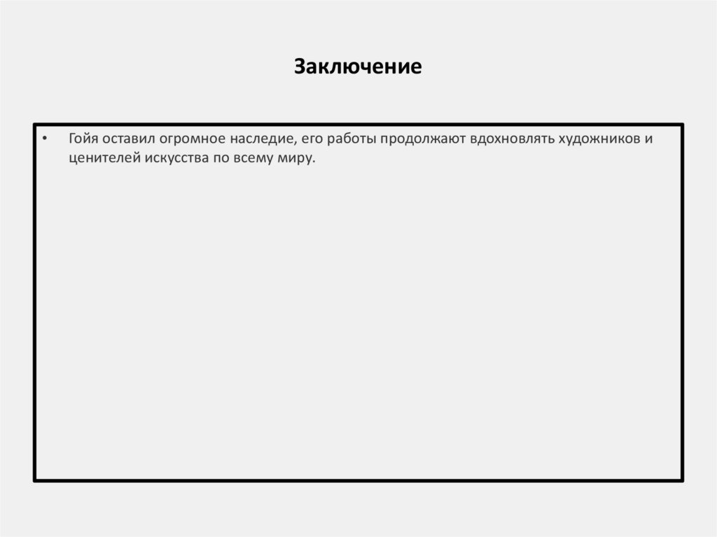 ЗаключениеГойя оставил огромное наследие, его работы продолжают вдохновлять художников и