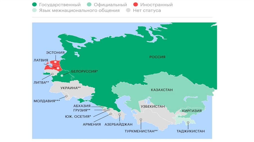 • Официальный язык в конституциях Казахстана, Кыргызстана.