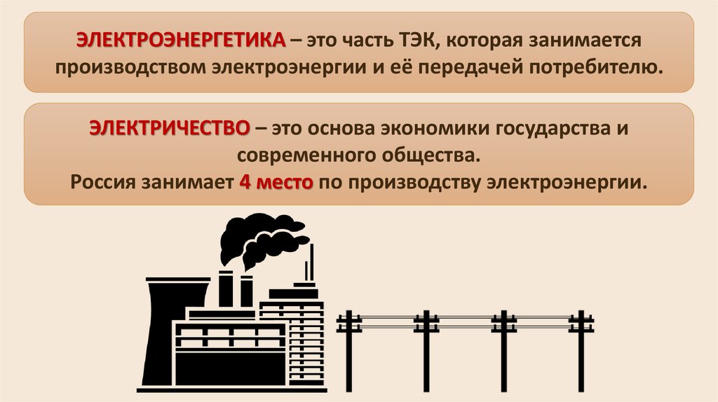 ЭЛЕКТРОЭНЕРГЕТИКА – это часть ТЭК, которая занимаетсяпроизводством электроэнергии и её передачей потребителю.