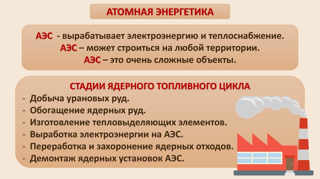 АТОМНАЯ ЭНЕРГЕТИКААЭС - вырабатывает электроэнергию и теплоснабжение.