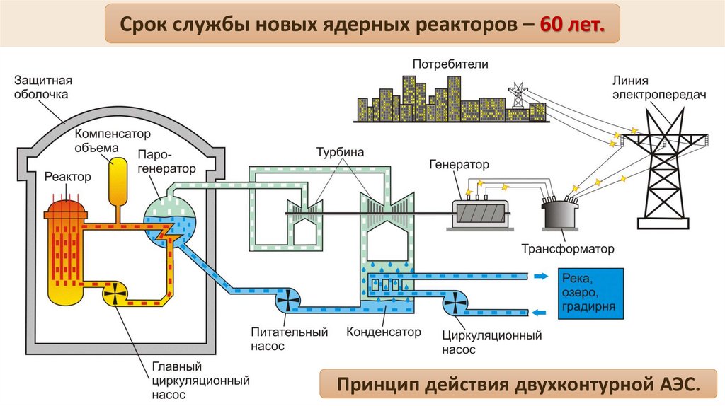 Срок службы новых ядерных реакторов – 60 лет.Принцип действия двухконтурной АЭС.