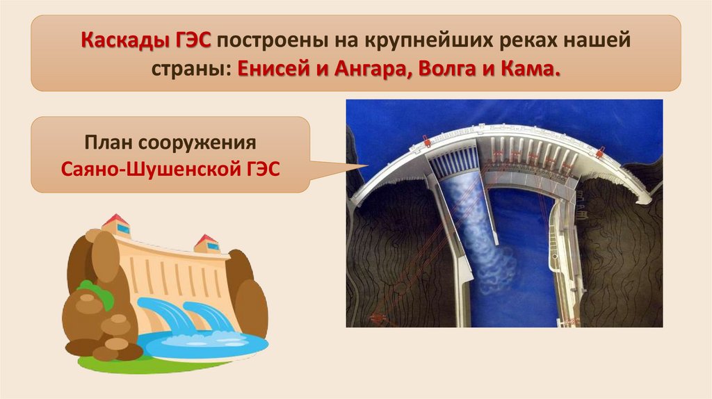 Каскады ГЭС построены на крупнейших реках нашейстраны: Енисей и Ангара, Волга и Кама.