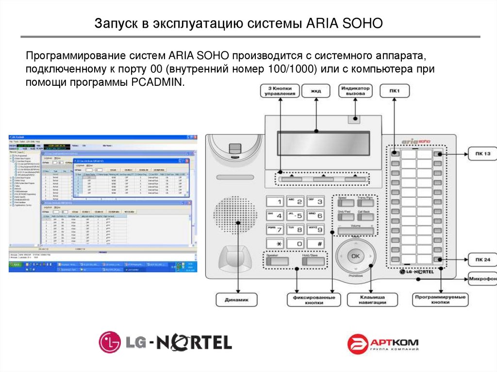 Программирование систем ARIA SOHO производится с системного аппарата,подключенному к порту 00 (внутренний номер 100/1000) или с компьютера при