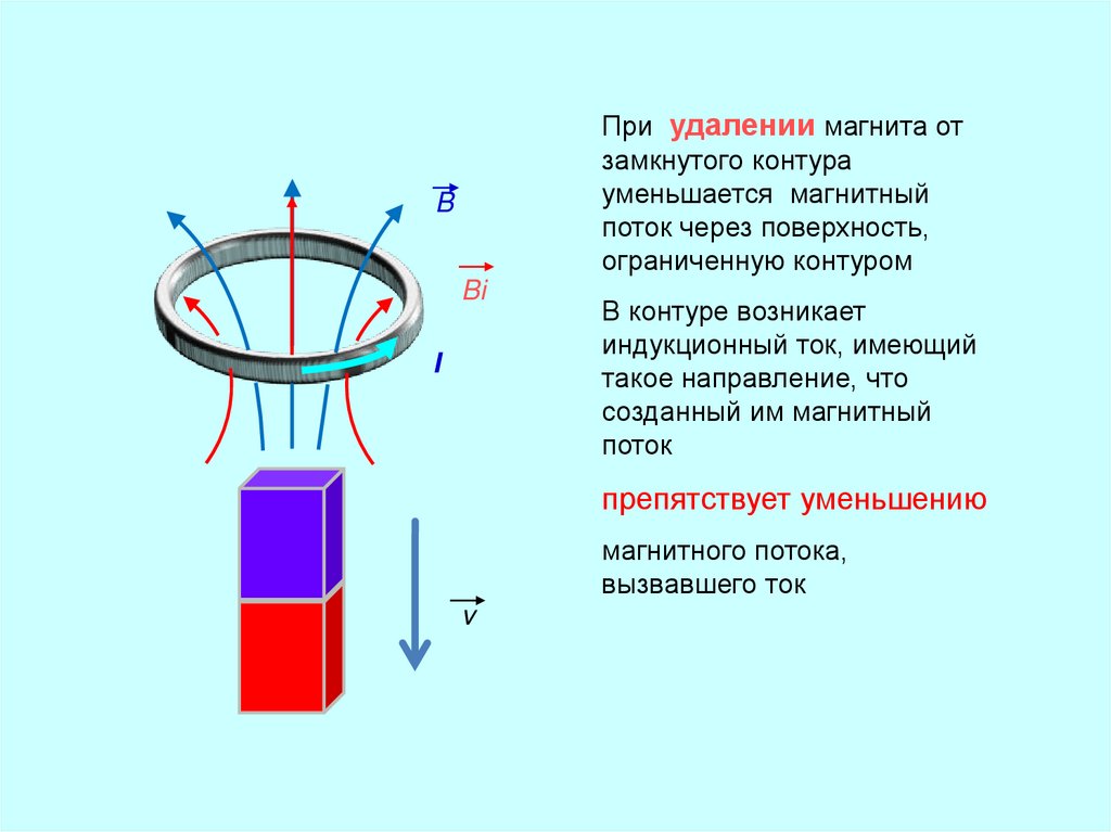 Магнит удаляется от кольца ( т.е. магнитный поток уменьшается)