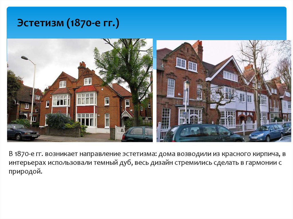 Эстетизм (1870-е гг.)В 1870-е гг. возникает направление эстетизма: дома возводили из красного кирпича, в