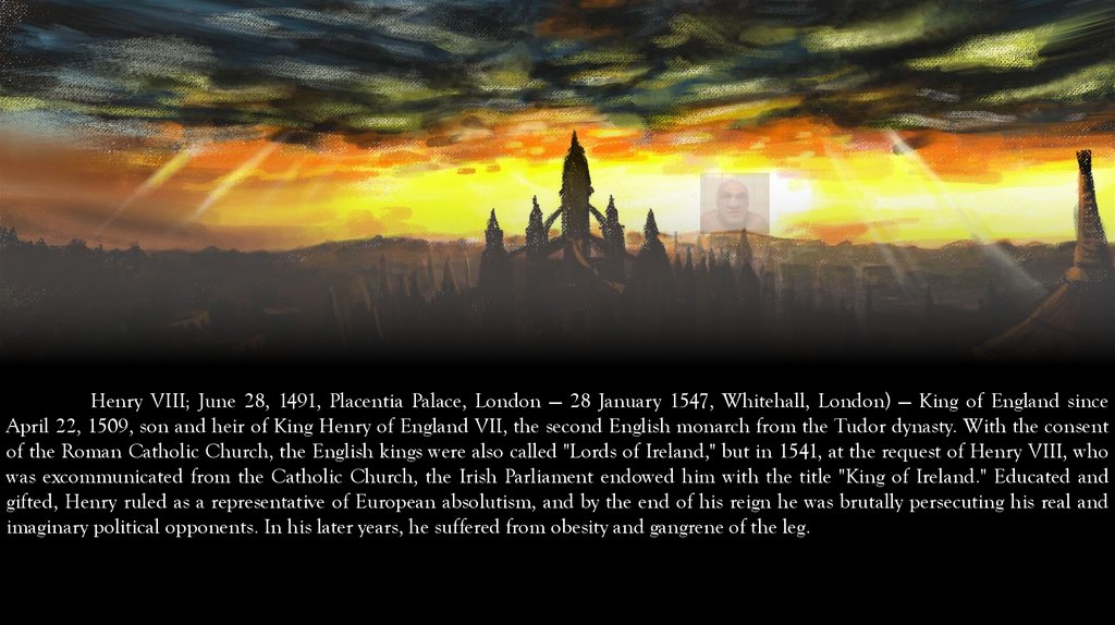 Henry VIII; June 28, 1491, Placentia Palace, London — 28 January 1547, Whitehall, London) — King of England sinceApril 22, 1509, son and heir of King Henry of England VII, the second English monarch from the Tudor dynasty. With the consent