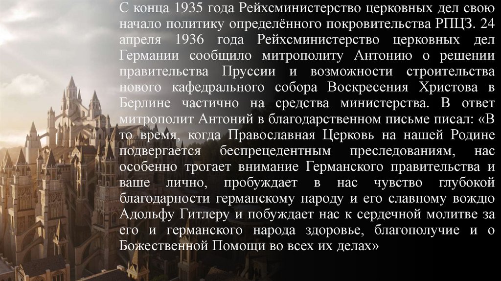 С конца 1935 года Рейхсминистерство церковных дел своюначало политику определённого покровительства РПЦЗ. 24