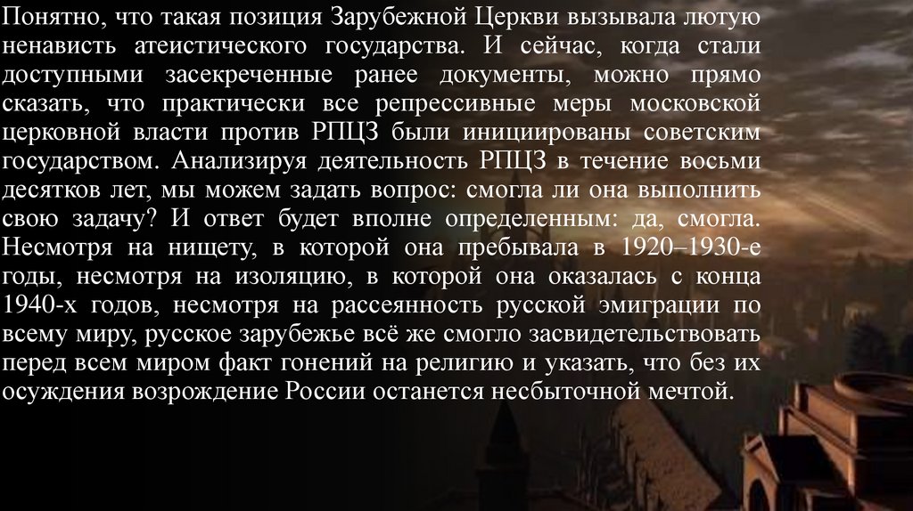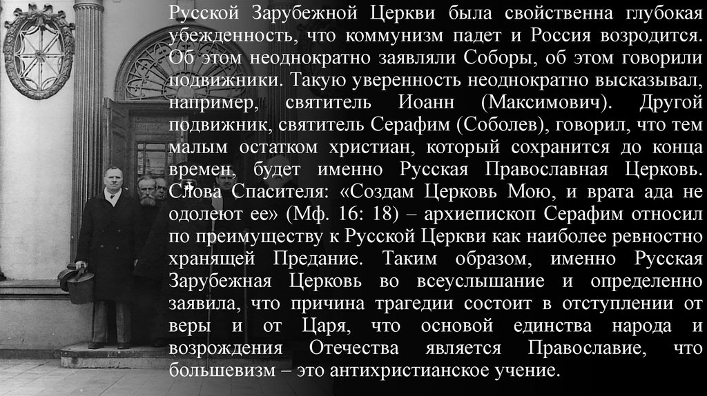 Русской Зарубежной Церкви была свойственна глубокаяубежденность, что коммунизм падет и Россия возродится.