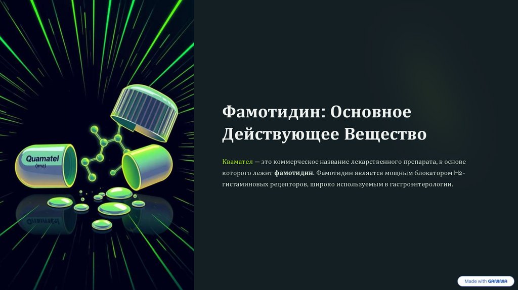 которого лежит фамотидин. Фамотидин является мощным блокатором H2гистаминовых рецепторов, широко используемым в гастроэнтерологии.